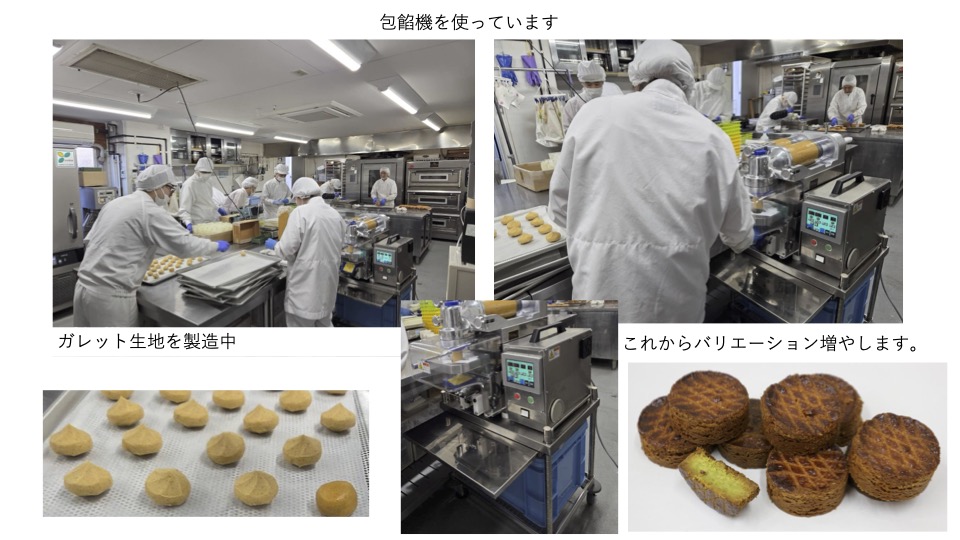 原材料、資材の高騰により4月には菓子値上げを考えておりますが、その時に箱菓子入れる菓子の新商品を包餡機で製造して作りたいと考えております。製造菓子に欠かせない包餡機でありますが、さらに機械を活かせるようにしていきたいと考えています。
