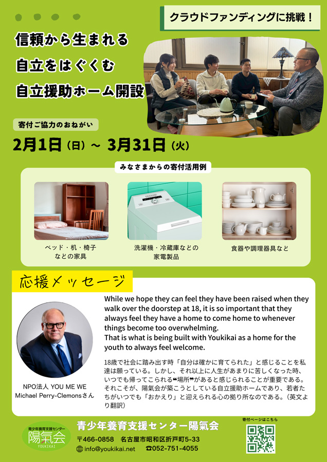 私たちは、自立援助ホームの立ち上げ・運営に向けて、クラウドファンディングに挑戦しています。