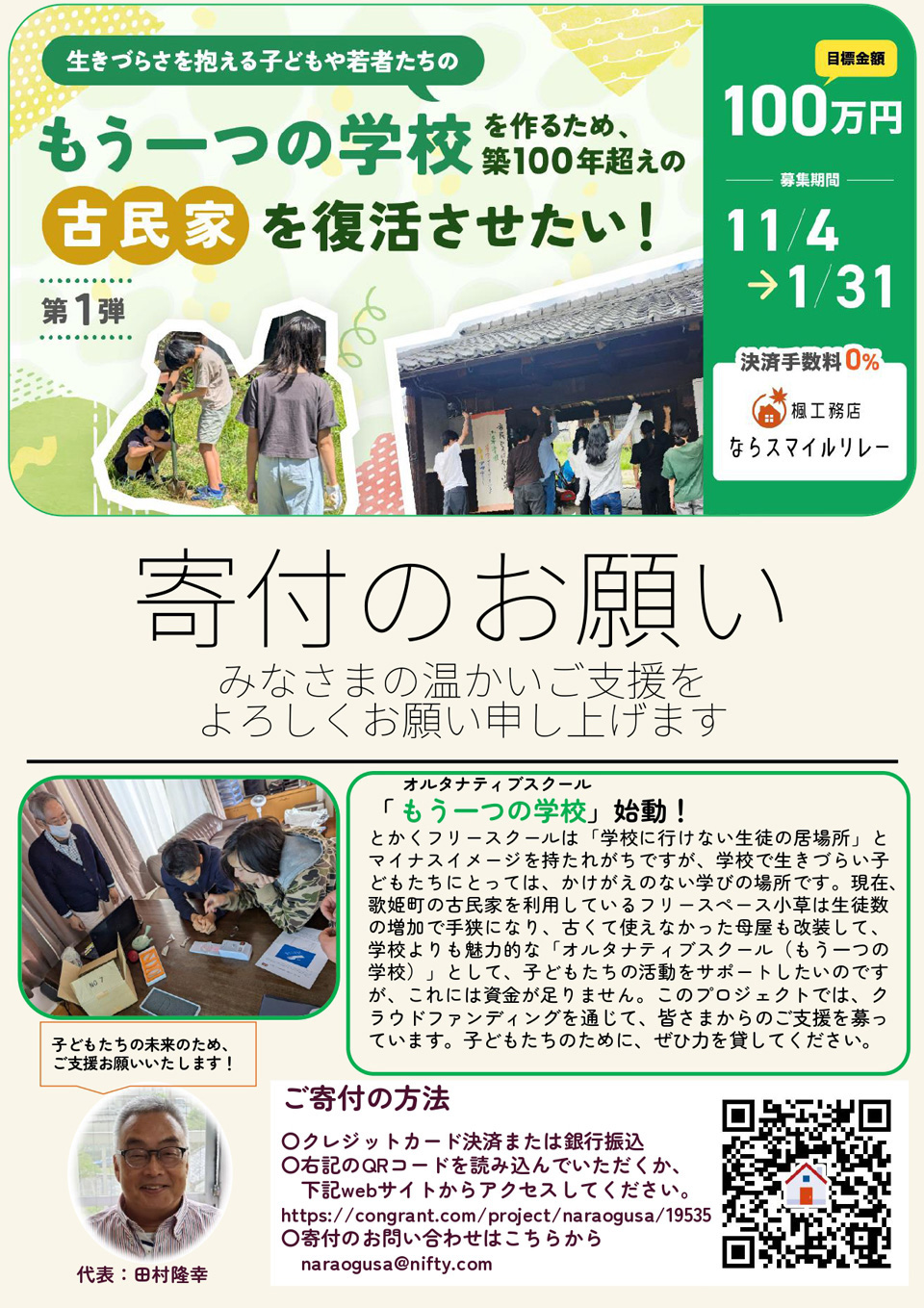 現在、歌姫町の古民家を利用しているフリースペース小草は生徒数の増加で手狭になり、古くて使えなかった母屋も改装して、学校よりも魅力的な「オルタナティブスクール(もう一つの学校)」として、子どもたちの活動をサポートしたいのですが、これには資金が足りません。
