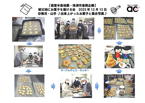 2011年から東日本・熊本大震災、そして2025年からは能登半島地震で被害にあった方たちのもとへ行き、カフェ・コンサートを行います。甘いお菓子が被災地の方たちを笑顔にします。横浜でお菓子を一緒に作りましょう。試食タイムでは、挽きたての珈琲と一緒に、活動紹介や被災地の様子についてお話しと防災についても意見交換をします。災害時にどんな事が出来るかこの機会に一緒に考えていきましょう︕