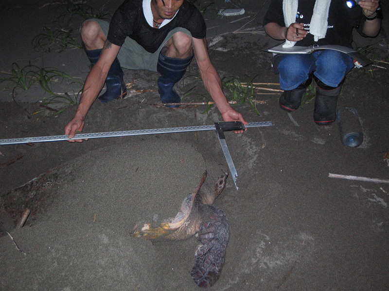 宮崎野生動物研究会は1973 年から、動物園職員や宮崎大学の職員・学生らのボランティアが、本土では一番上陸・産卵数が多い宮崎県の一ツ葉海岸周辺の 25 ㎞にわたり、アカウミガメの調査を開始しました。その後、今日まで一貫して、宮崎市周辺の海岸を中心としてアカウミガメの調査を続けて参りました。