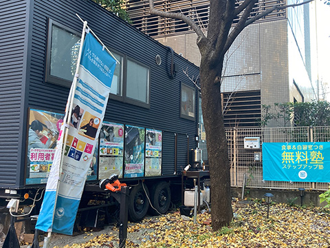 企業協賛により 今後の全国展開に先駆けて2018年より運用を開始したトレーラーハウス型教室「ステップアップ塾 西新宿教室」 新宿区の後援、協力を経て旧淀橋第三小学校に設置を実現し 現在に至る