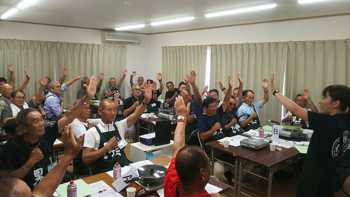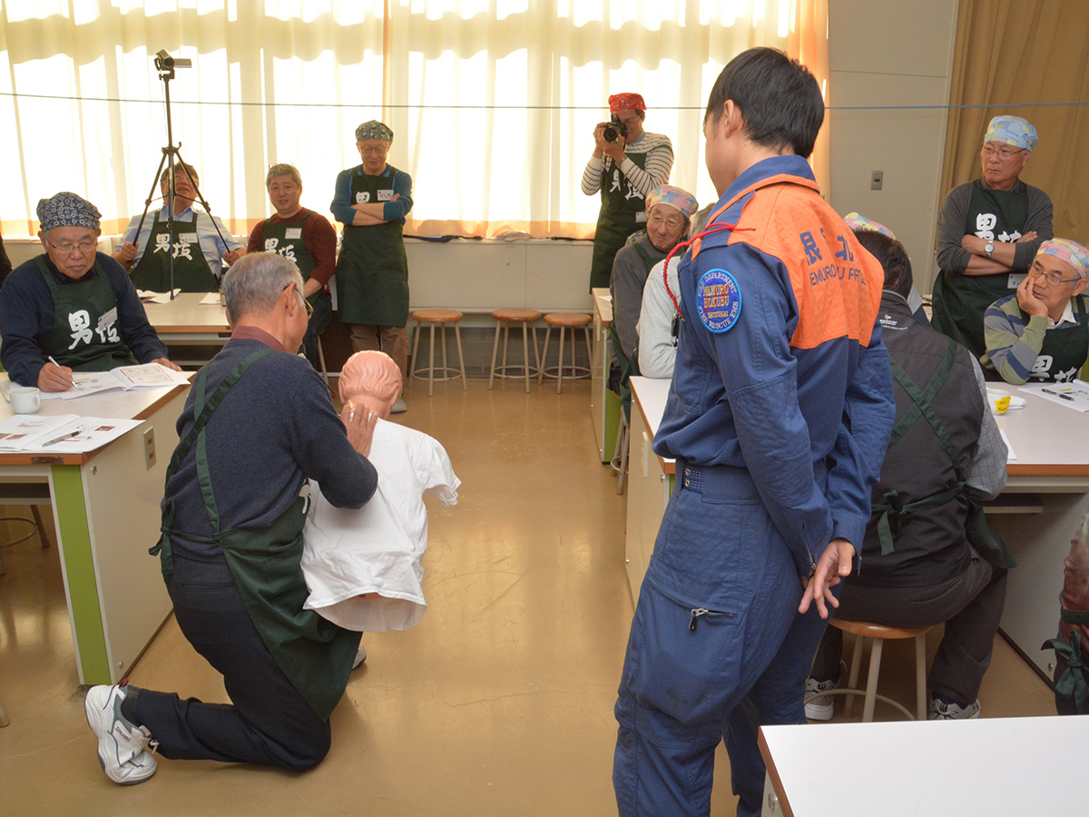 教室では、「男技」と書かれたエプロンを全員が身に着け、講義や調理実習に参加していただきます。介護に必要な知識や技術を学ぶとともに、特に「食べること」「生きること」に直結する内容を重視しています。
