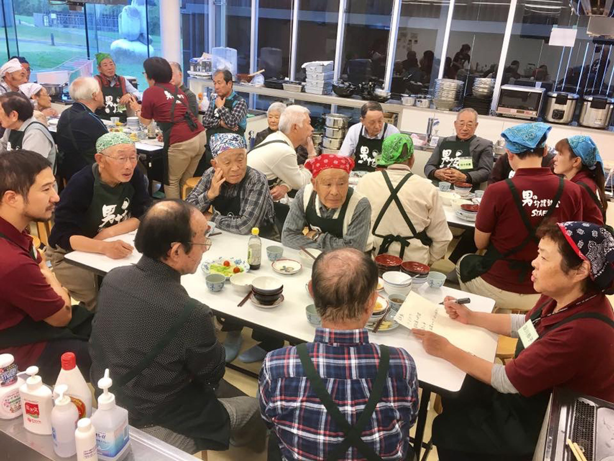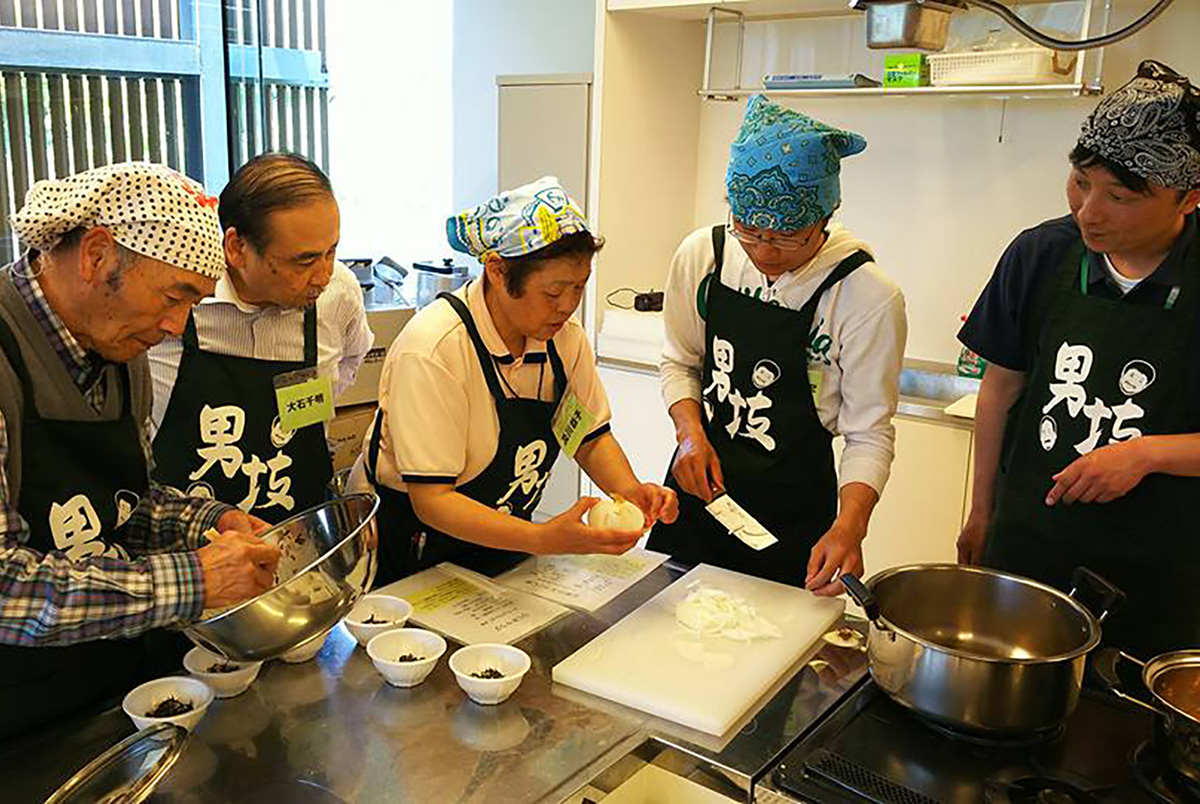ある日突然、男性が家族の介護に関わることになったら。超高齢化社会の日本の在宅介護者の性別割合では35%*が男性だという。男性は育児や家事の経験や地域社会との関わりが少なく、さらに家庭内の悩みを誰かと話すことに抵抗があり、孤立に陥りやすい。結果、要介護者への暴力やひいては殺人にいたるケースも。そんな男性の孤独を防ぎ、仲間と交流しながら、相談の場を提供しているのが、男の介護教室。代表で、歯科医の河瀬聡一朗さんは、重度の摂食嚥下障がいを持つ妻と妻を介護している夫が受診した際、夫の介護についての話を聴く中で、男性が集い、介護について学べる場が必要と感じ、2014年、宮城県石巻市で医科の医師、ケアマネージャーや栄養士ら11名と立ち上げた。教室には介護について学びたい男性、介護中の男性、家族を看取った男性らが集まった。参加者、スタッフが共通の「男技」エプロンを着用する。講義にはじまり、実習、調理、試食という流れ。実習では介護についての一般的な内容のほか、特に食べることについて重点を置いている。他にも介護サービスの利用法、死に関する講義なども行う。介護者を支援する活動が話題を呼び、現在全国に20教室を展開。参加後、怒鳴らなくなった、後片付けをするようになった、明るくなったなど、家族から好評を得ており、リピーターも90%以上と地域の介護者を支えている。