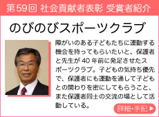 高知市において、家庭や学校、社会に適応しなくなった少年少女を、里親として家庭に引き取り、更生に取り組むなど、幅広い社会福祉活動を行っている。これまでに夫妻が関わってきた子どもは数百名、世話をした子どもは百名近くにおよび、地道な熱意のある取り組みにより多くの少年少女を自立させている。 >>詳細