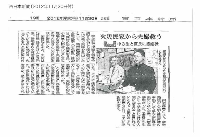 平成24年11月19日、福岡県宇美町で発生した住宅火災で、下校途中の小林さんは建物内に人影を目撃したため、付近にいた竹内さんに「中に人がいる」と声を掛けた。二人で建物内に入り、70歳代の夫婦を救出した。火は天井まで達しており、救助された夫人は足に火傷を負っていたため、二人で脇を抱えるように外へ連れ出した。その後消防隊が到着した。消防隊は「防火服を着ていても近寄りがたいほどの熱さだった。二人に救出されていなければ、ご夫婦の命は危なかったかもしれない」と語った。